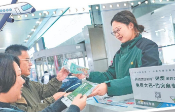 上图:10月27日,济南机场出口柜台处,两位旅客凭登机牌领取免费游趵突泉景区兑换券。下图:济南机场至趵突泉景区专线巴士。(记者陈景郁报道)