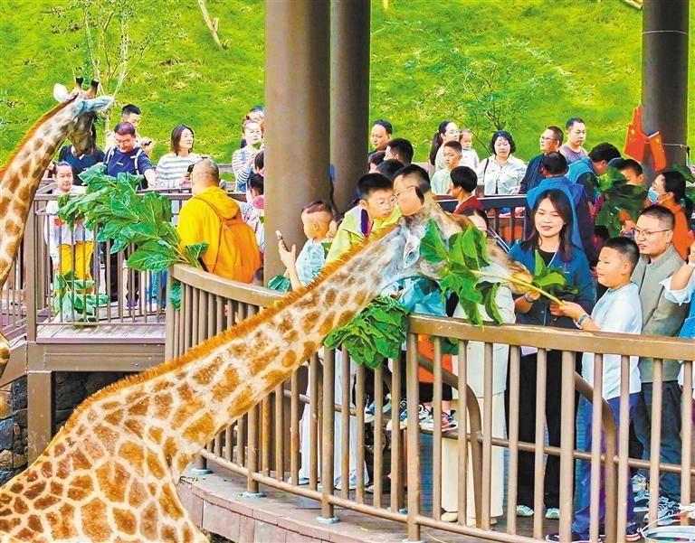 5月1日,游客在清江湾旅游度假区的三峡长颈鹿乐园与长颈鹿互动。