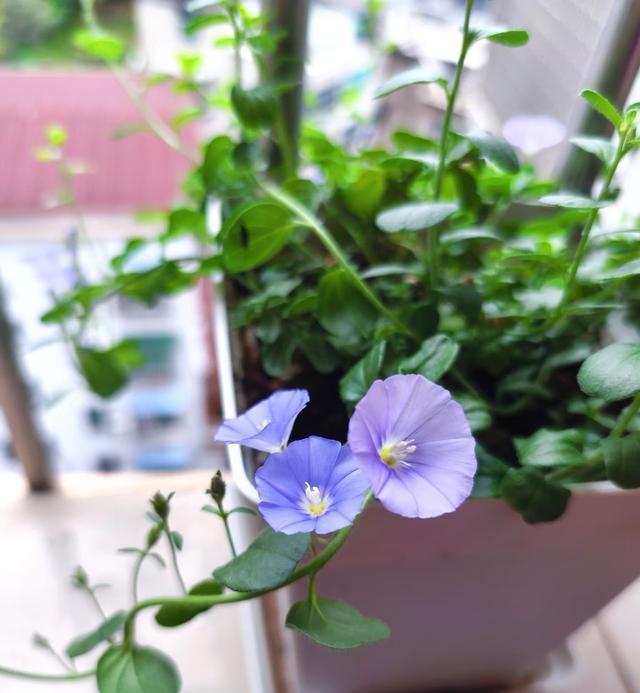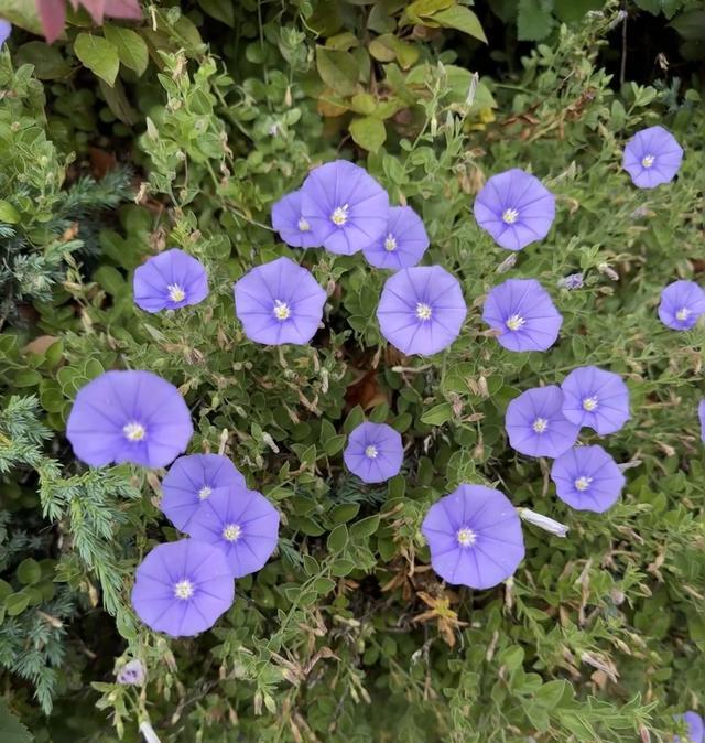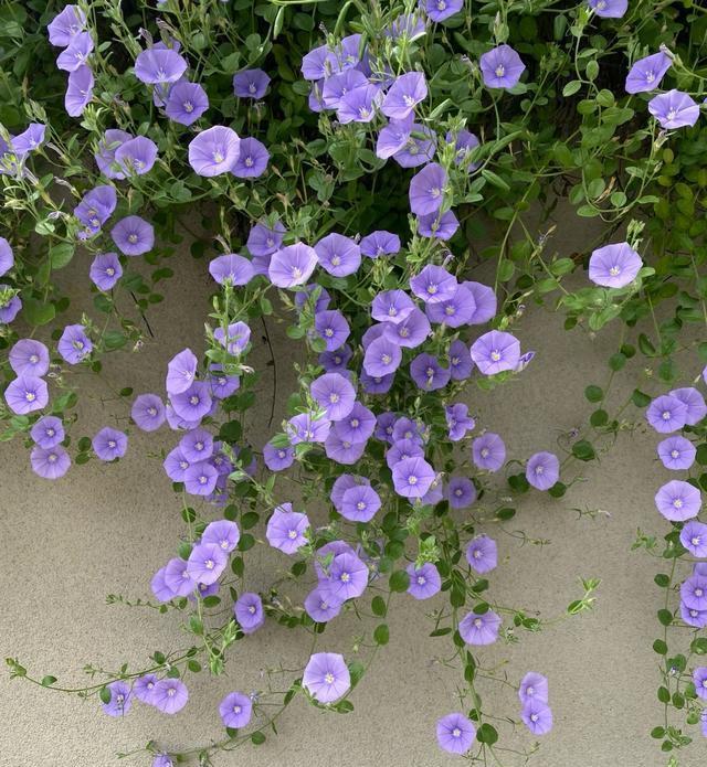 蓝色岩悬花,或曰紫色岩悬花(反正蓝紫不分家),学名Convolvulus sabatius,看着长得像牵牛花,和牵牛花也有一点点亲缘关系,同为茄科植物,但它是旋花科的,直立或缠绕草本植物或亚灌木植物,原产于非洲北部,多年生,作为观赏植物为多国所引种,主要做花墙植物、地被植物,盆栽种植也可以。
