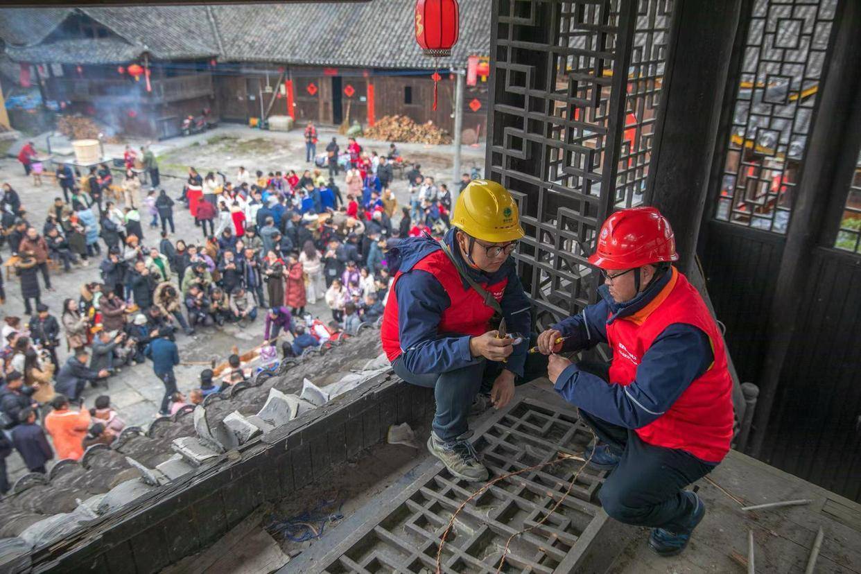 上午8时许,笔者跟随湖南湘西龙山县供电公司田昌平、吴永峰等4名员工,一同踏入这如梦如幻的古寨。此时,一场以“快乐土家年”为主题的沉浸式年俗体验活动,正于这座千年古寨中徐徐铺展。数千名游客与村民从四面八方汇聚而来,欢声笑语回荡在每一处角落,现场热闹非凡。而在这浓郁得化不开的年味背后,一场保障电力供应的守护行动,正悄然拉开帷幕。